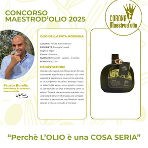 Olio della Fata Morgana ha ricevuto la prestigiosa Corona Maestro d’Olio 2025, riconoscimento assegnato dall’Accademia Maestrod’olio ai migliori oli extravergini d’Italia.